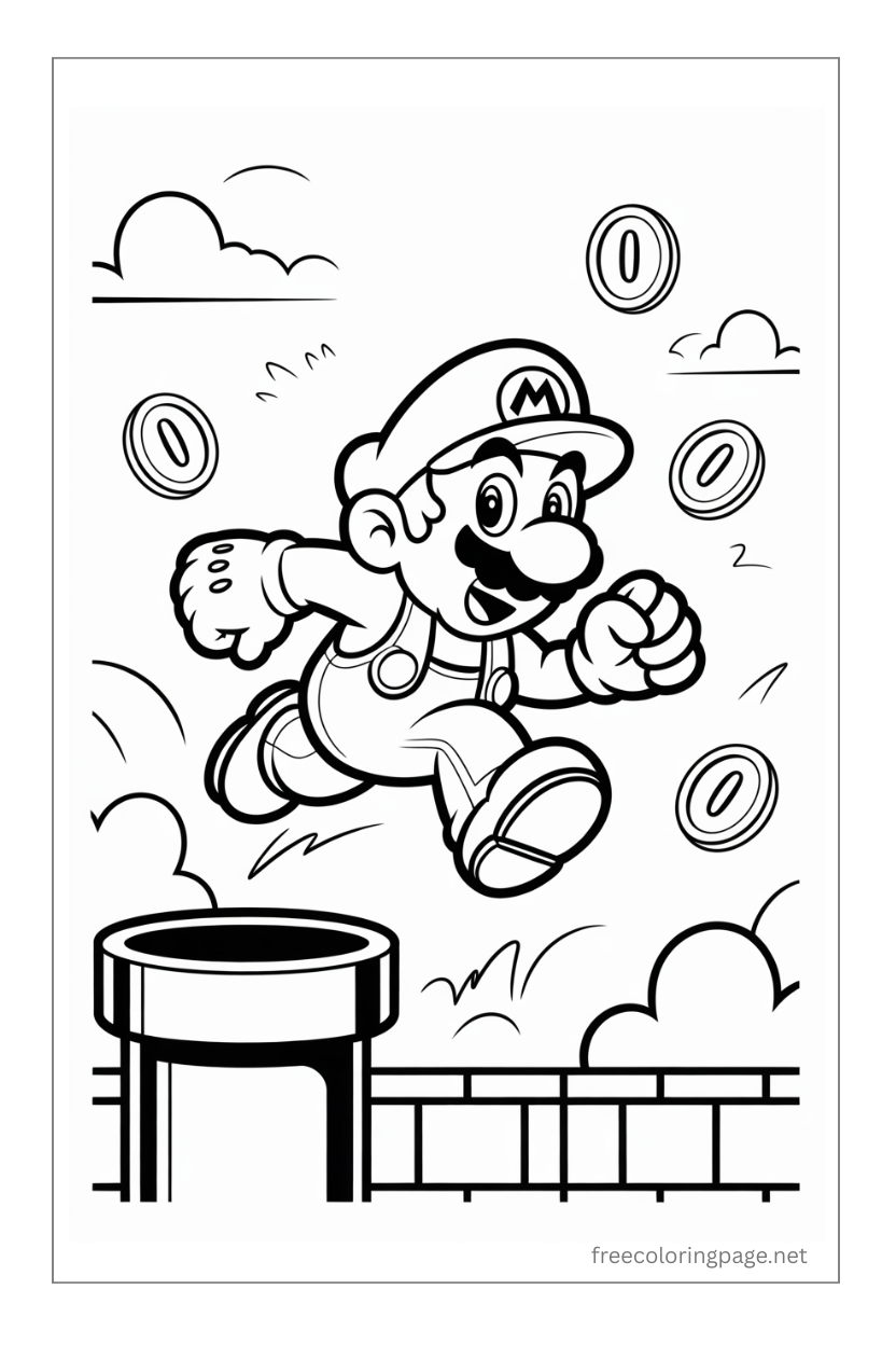 Large, bold outlines of Mario jumping or collecting coins, perfect for preschoolers.